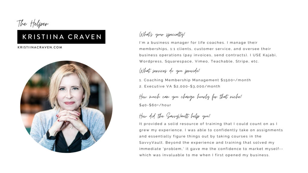 Meet Kristiina. After taking our signature program, the SavvySystem, she decided to specialize in business management for life coaches. Now she’s making $40-$60 per hour doing work that she loves.