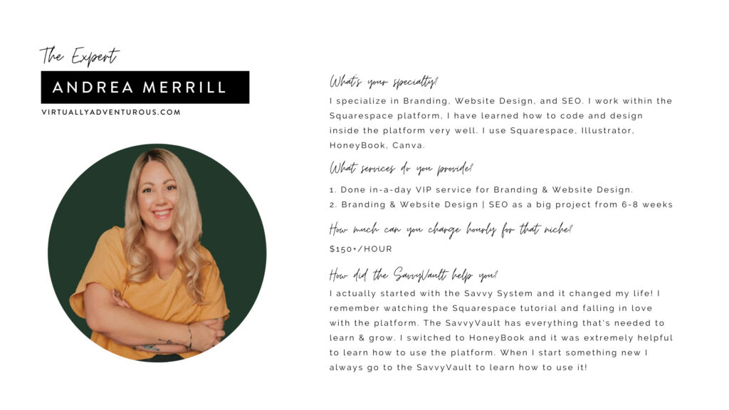 Meet Andrea. She specializes in branding, web-design and SEO, making a minimum of $150 or more per hour with her services!